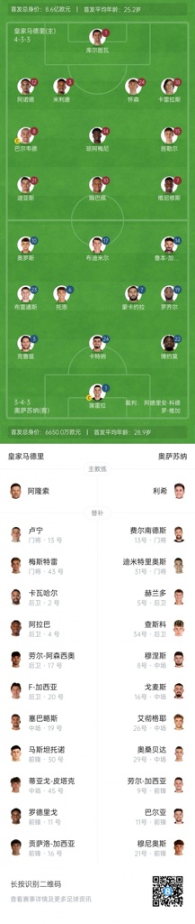皇家马德里首发:1-库尔图瓦、12-阿诺德、3-米利唐、24-怀森、18-卡雷拉斯、14-琼阿梅尼、8-巴尔韦德、15-居勒尔、21-迪亚斯、10-姆巴佩、7-维尼修斯